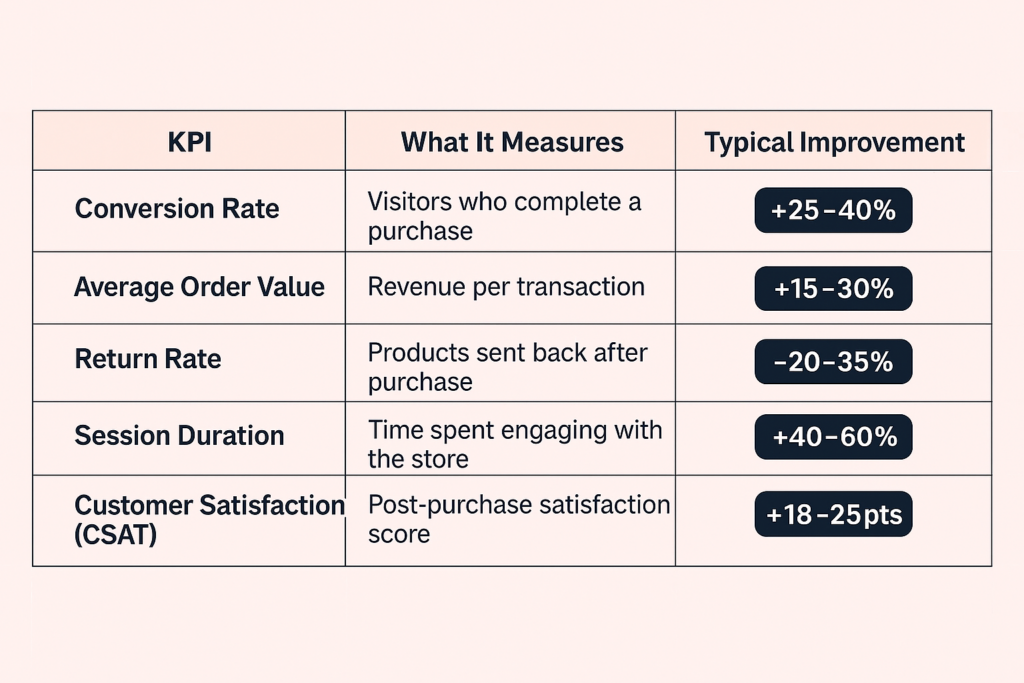 Implementing an AI sales assistant for ecommerce is an investment. Here are the key performance indicators that fashion brands track to measure ROI:
